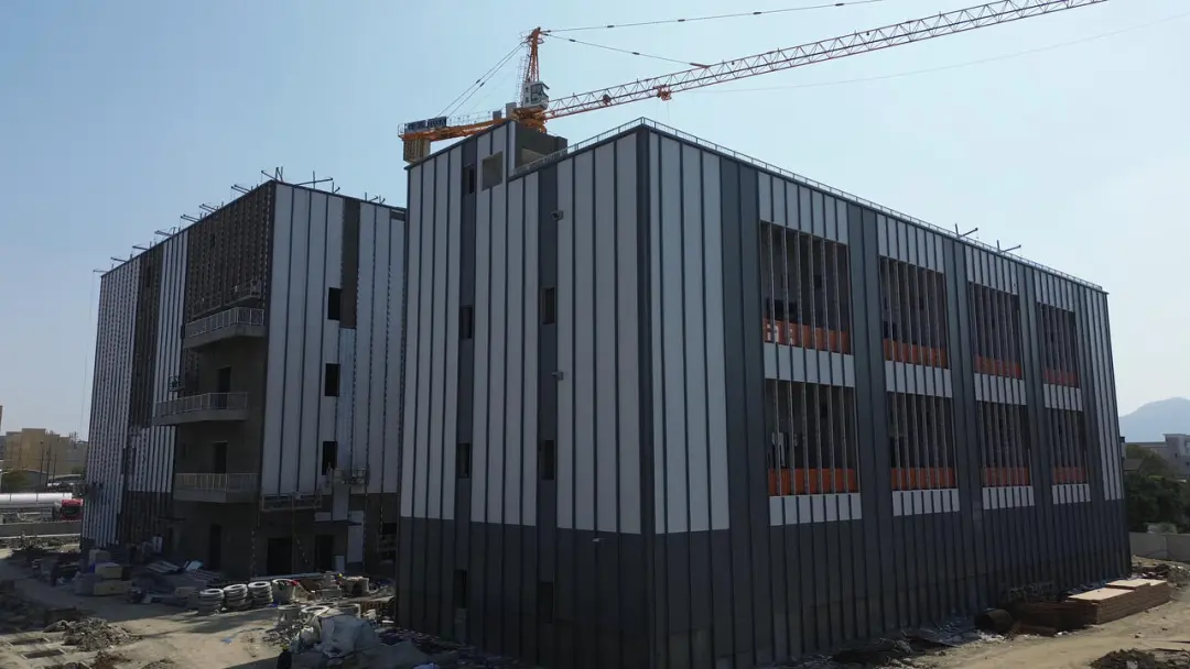 两栋灰白相间的主体建筑正进行最后的立面装饰作业