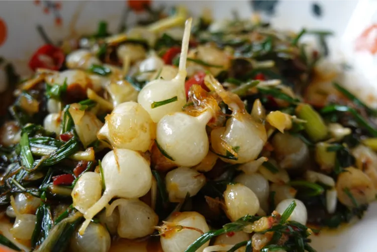庆阳民间有“三四月的小蒜,香死老汉”的说法。春风里,小蒜带着辛香在田埂坡头生长,挖取的过程更添温情。油泼小蒜拌饸饹,辛香润面,是陇东人舌尖的灵魂滋味;剁碎烙成小蒜饼,面柔蒜香,唇齿生香;腌制成佐菜,酸辣清口,解腻开胃。一口小蒜,嚼出庆阳春日的鲜活。