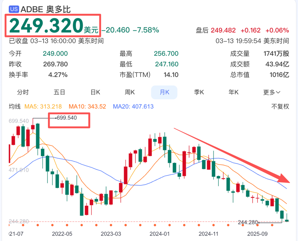 作为曾是全球市值最高的专业SaaS公司,Adobe 2026年股价已下跌近30%,市值较高峰期缩水超三分之二。