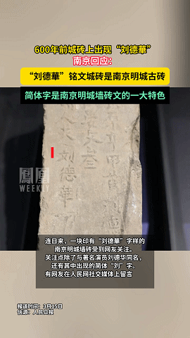 近日,一块印有“刘德華”字样的南京明城墙砖引发网友讨论。除了与著名演员刘德华同名外,砖上的简体“刘”字也成为焦点。有网友疑问:“古代‘刘’字不是繁体‘劉’吗?”南京城墙保护管理中心相关负责人表示,这块带有“刘德華”铭文的城砖确为明代城砖,简体字是南京明城墙砖文的特色之一。