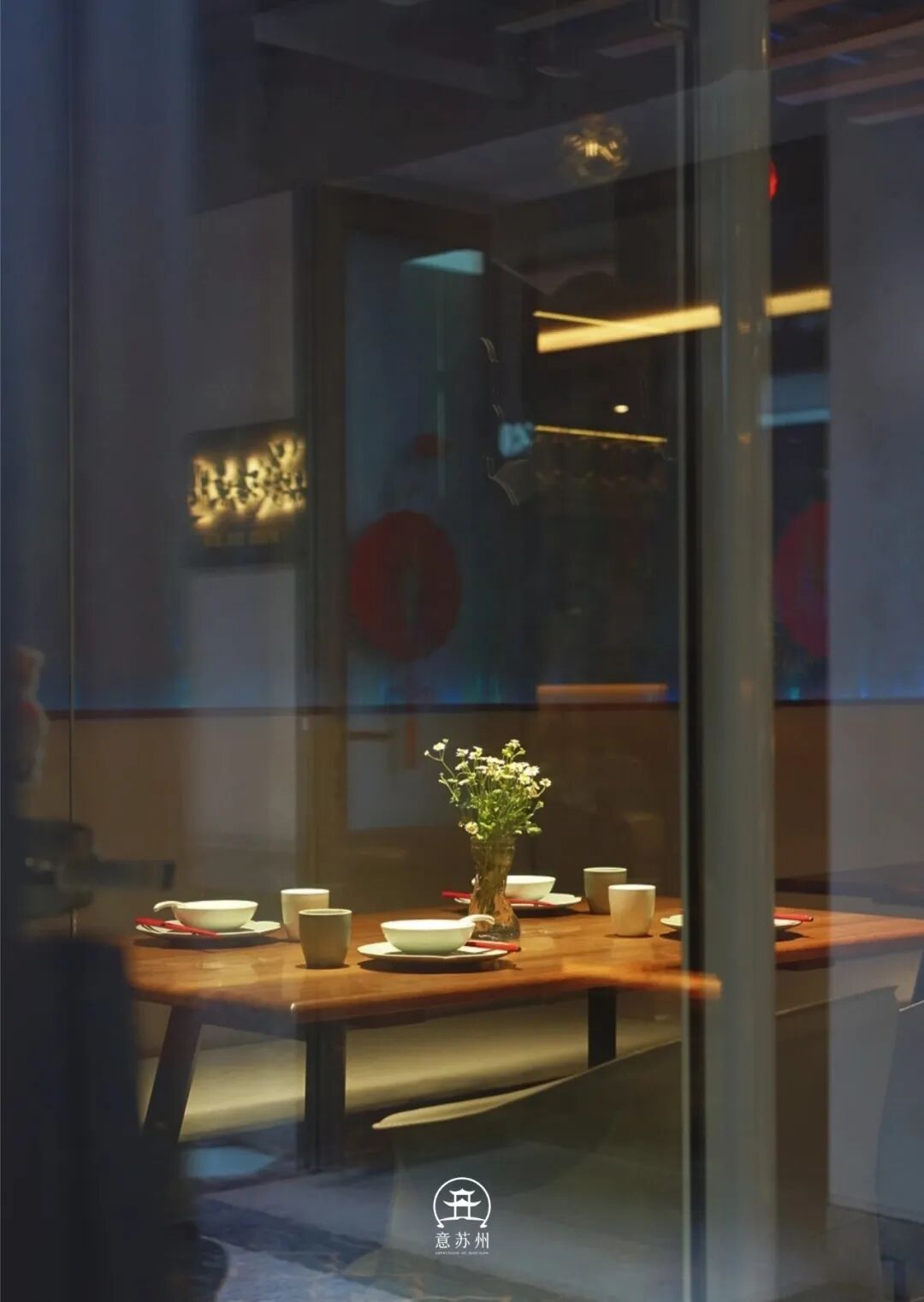 原木长桌铺展,白瓷杯盏错落,朱红筷枕点缀其间,尽显苏式生活的雅致与悠然。最是动人的,当属桌中央那只透明玻璃瓶——几枝素白小花亭亭而立,在暖黄灯光与玻璃倒影交织中,晕开静谧温柔的光晕。