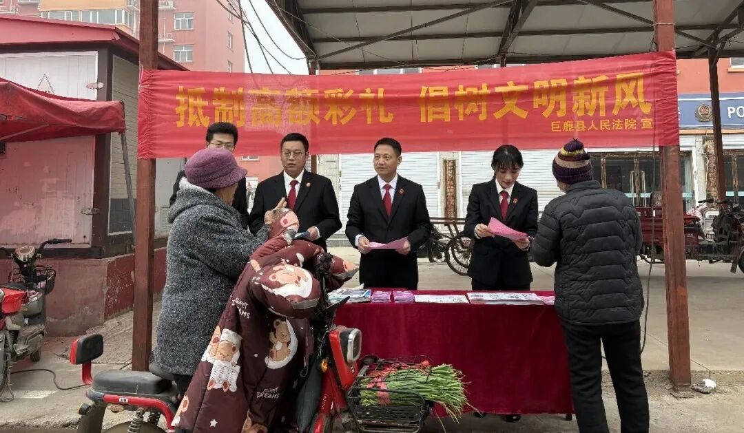 每当官亭村集市热闹非凡时,“一麓平安”普法小分队便准时“出摊”。他们在人群密集处设置咨询台、悬挂横幅,干警们化身“法律服务员”,手持《婚姻家庭普法宣传册》和文明婚俗倡议书,结合巨鹿当地实际,用方言和典型案例,把彩礼认定标准、法律返还边界等实用内容讲清楚、讲透彻。