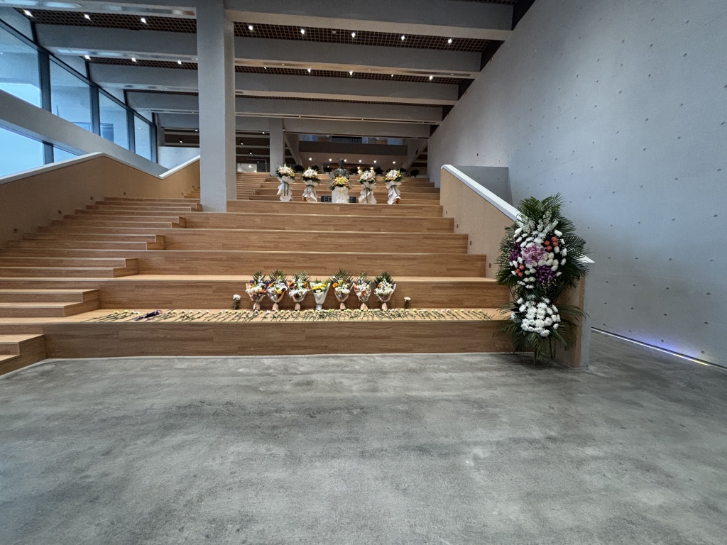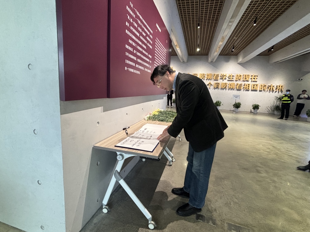 于漪教育教学思想研究中心一楼大厅入口处设立了签到台,并摆放了鲜花,供缅怀致敬取用。