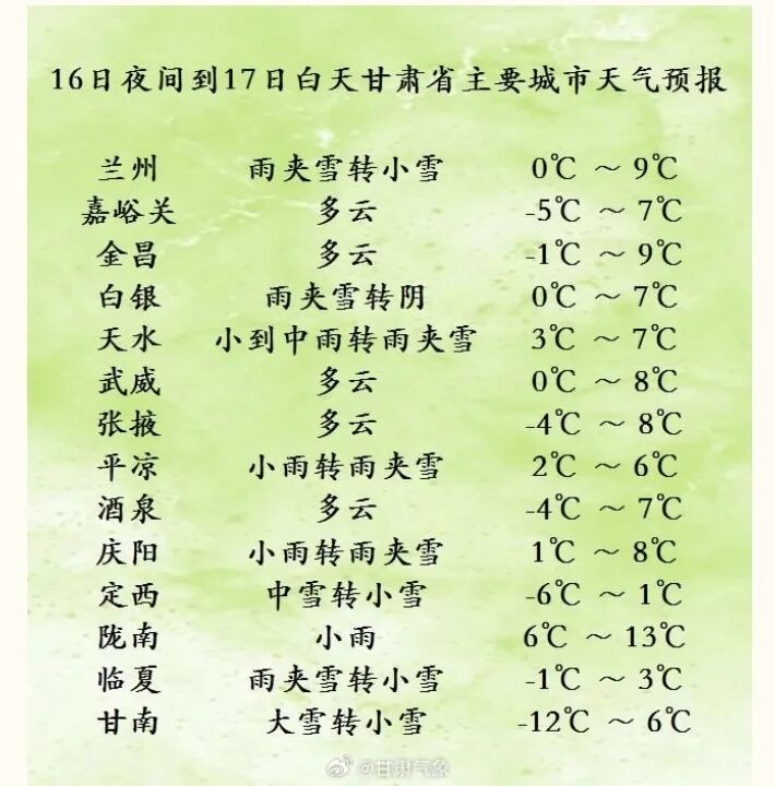 原标题:《雨雪继续!甘肃最新天气预报:局地有大雪,多地有小雨雪或雨夹雪》