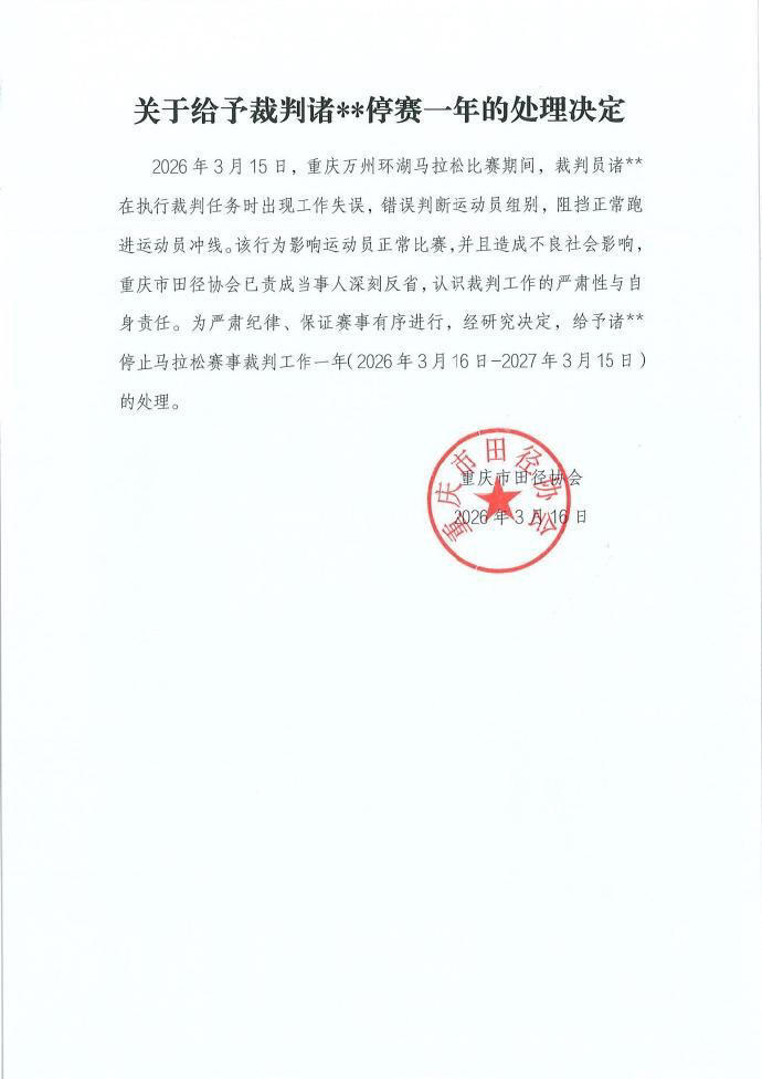 “经研究决定,给予诸XX停止马拉松赛事裁判工作一年(2026年3月16日-2027年3月15日)的处理,责成其深刻反省裁判工作的严肃性与责任。”