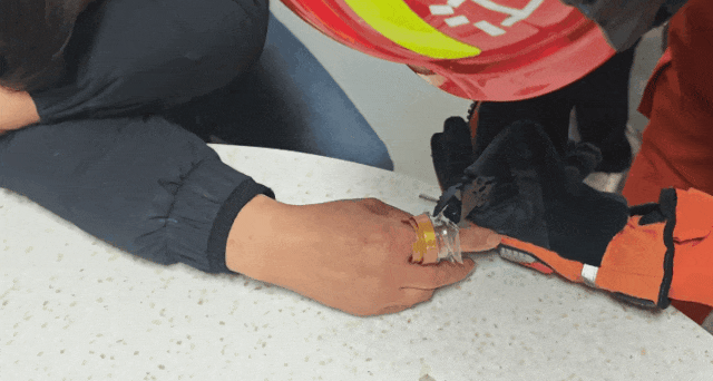消防员先为外籍人士做好防护措施,随后使用角磨机切割戒指,待切面变薄后,用斜口钳顺利剪断戒指。经检查,其手指仅轻微肿胀,并无大碍。
