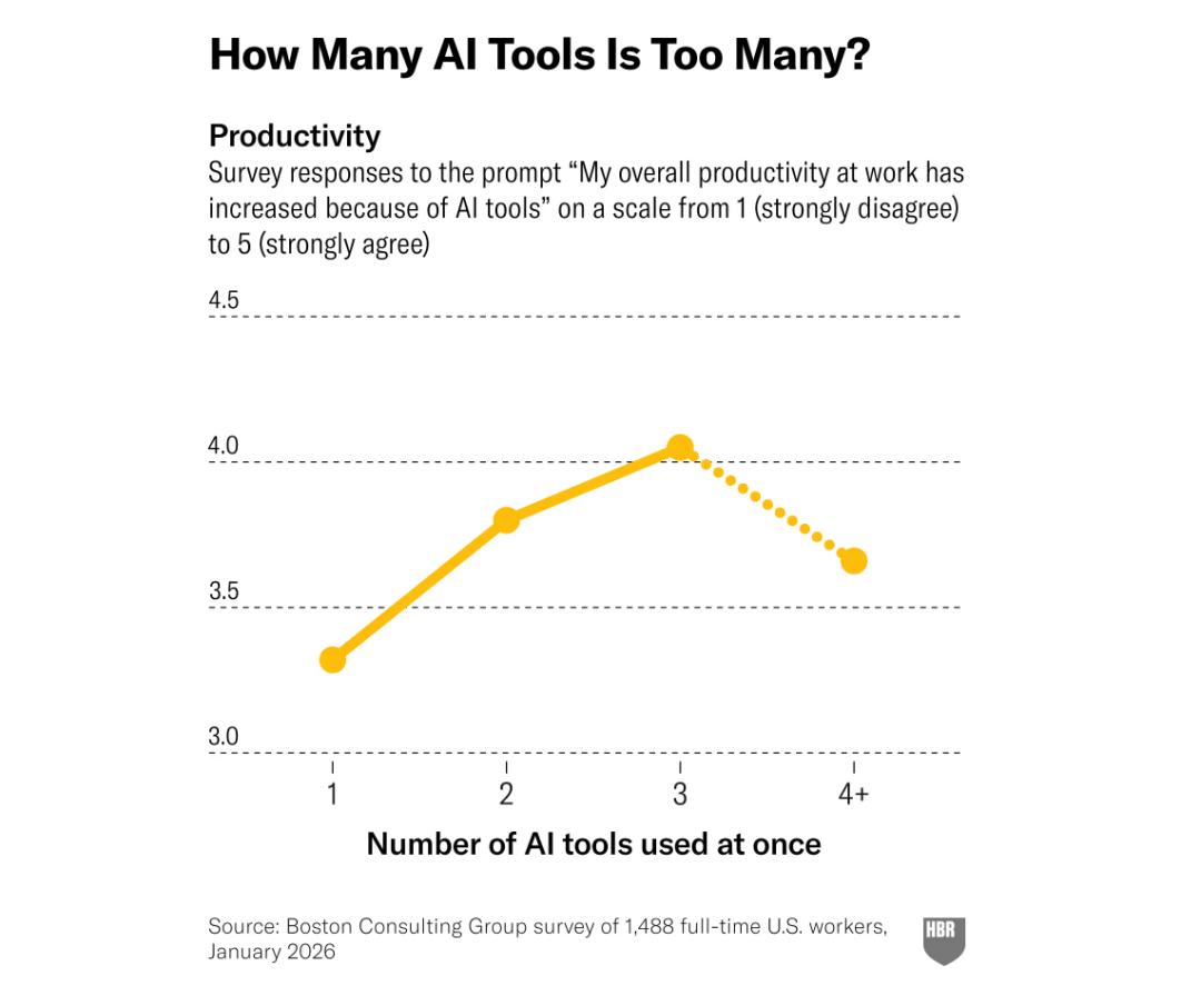 研究发现,同时用1-2个AI工具时生产力显著提升,到第3个时增速放缓,再增加一个生产力反而下降,所以3个是临界点。