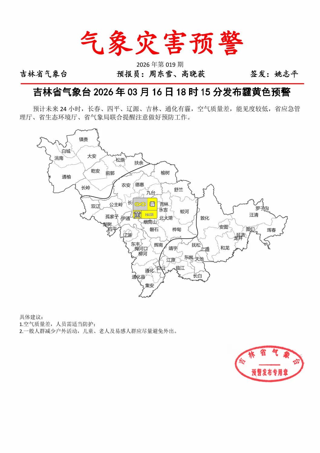 根据气象预测,未来24小时内,长春、四平、辽源、吉林、通化等地将出现霾天气,届时空气质量较差,能见度会明显降低。省应急管理厅、省生态环境厅、省气象局已联合发出提醒,呼吁公众做好相关预防工作。