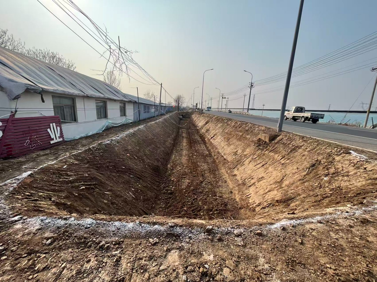 在第三标段留吕片区丁家楼村东,沟渠清淤疏浚与管道埋设工作也在火热进行中。5米宽、1.5米深的沟渠已畅通无阻,彻底解决了周边农田和大棚排水难问题。
