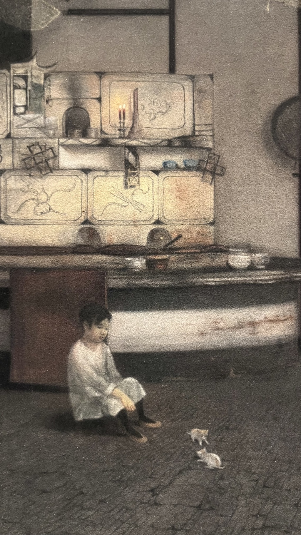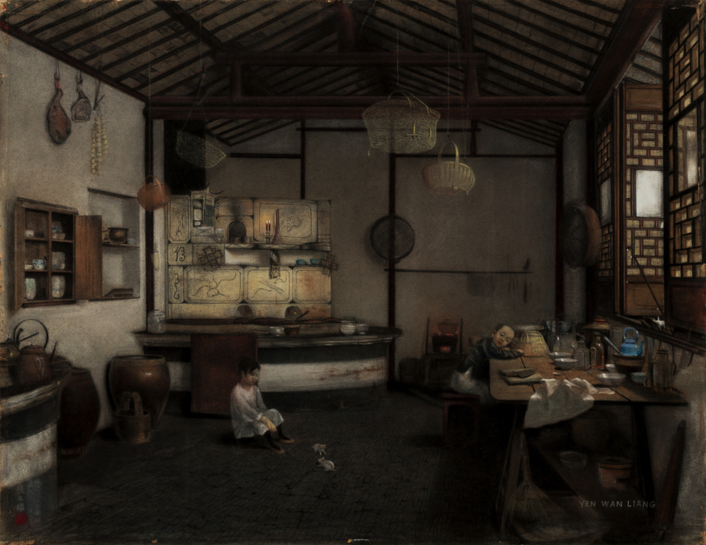 颜文樑1919年尝试粉画,1920年创作《厨房》,精细描绘苏州殷实之家厨房的光影与细节,展现日常生活之美,是其重要代表作。