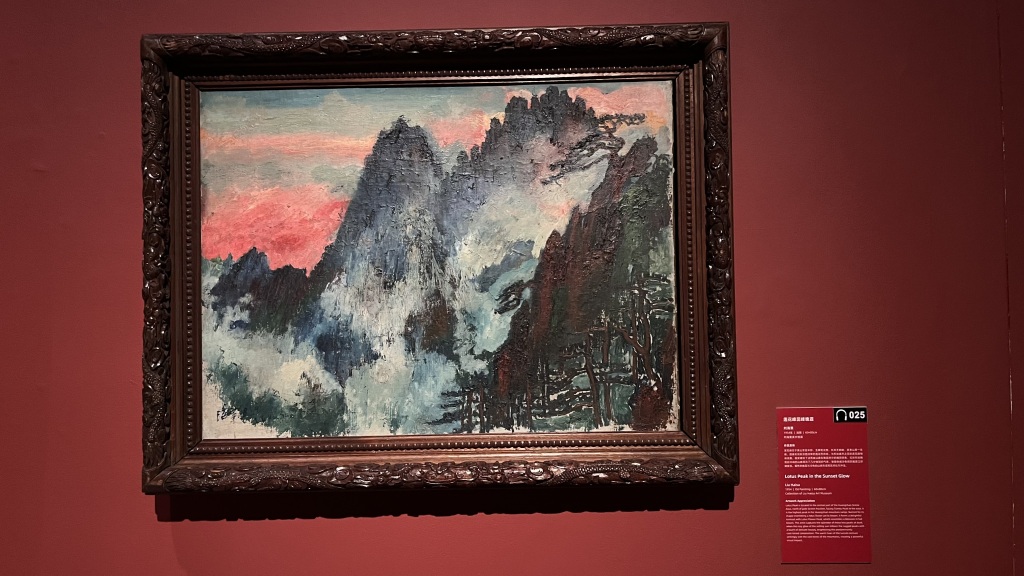刘海粟十上黄山,《莲花峰蕊峰晚霞》以暖色晚霞与冷色山峰形成对比,提亮冷调画面,展现黄山瑰丽景色。