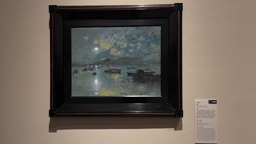 《月夜泛舟》用西方技法描绘中国传统题材,扁舟行于幽蓝湖面,皓月当空,构图别致,用色淡雅。