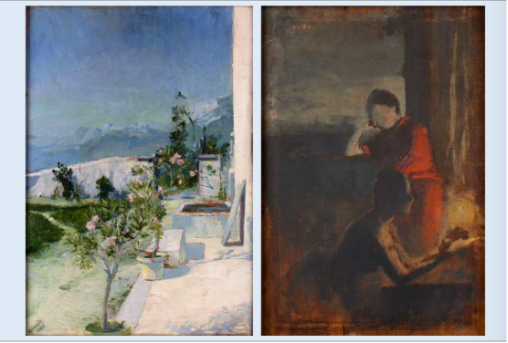 刘海粟欧游时结识巴黎美院院长贝纳尔,引进西方教育体系。展览展出贝纳尔三件双面油画,《有粉色月桂的山景》正反题材不同,源于材料拮据的匠心巧思。