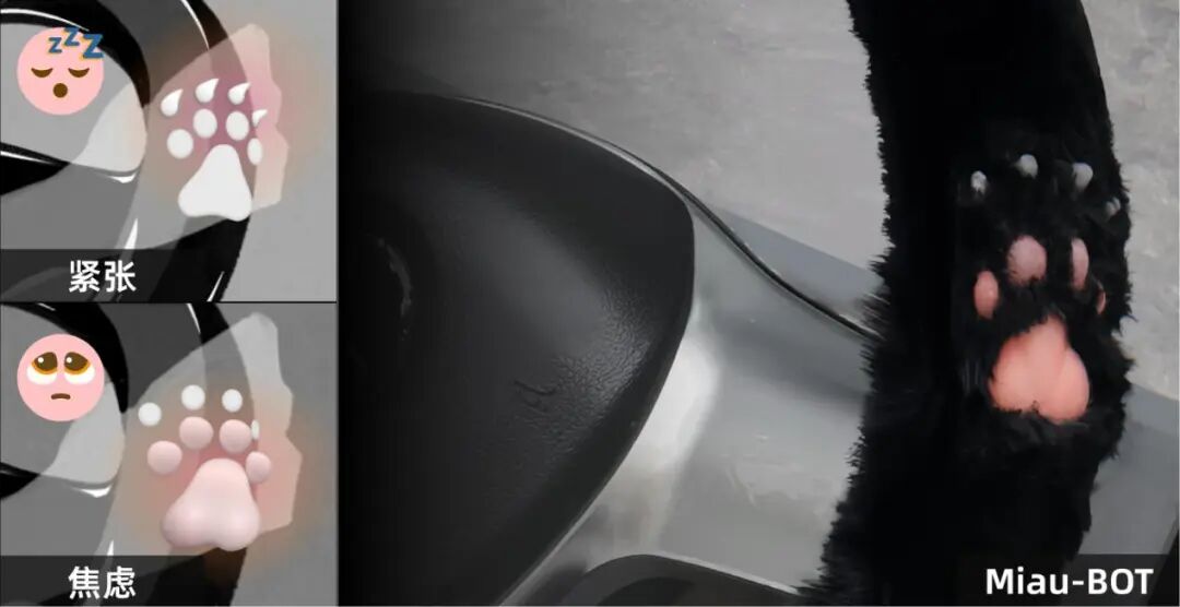 2024年,因课程契机,姚郗文开启了Miau-BOT项目(团队称“猫爪项目”),围绕驾驶场景负面情绪调节展开触觉交互研究。项目将模拟猫爪结构的气动触觉装置嵌入方向盘,在不打断驾驶体验的前提下,辅助判断驾驶者状态并给予触觉反馈提醒。