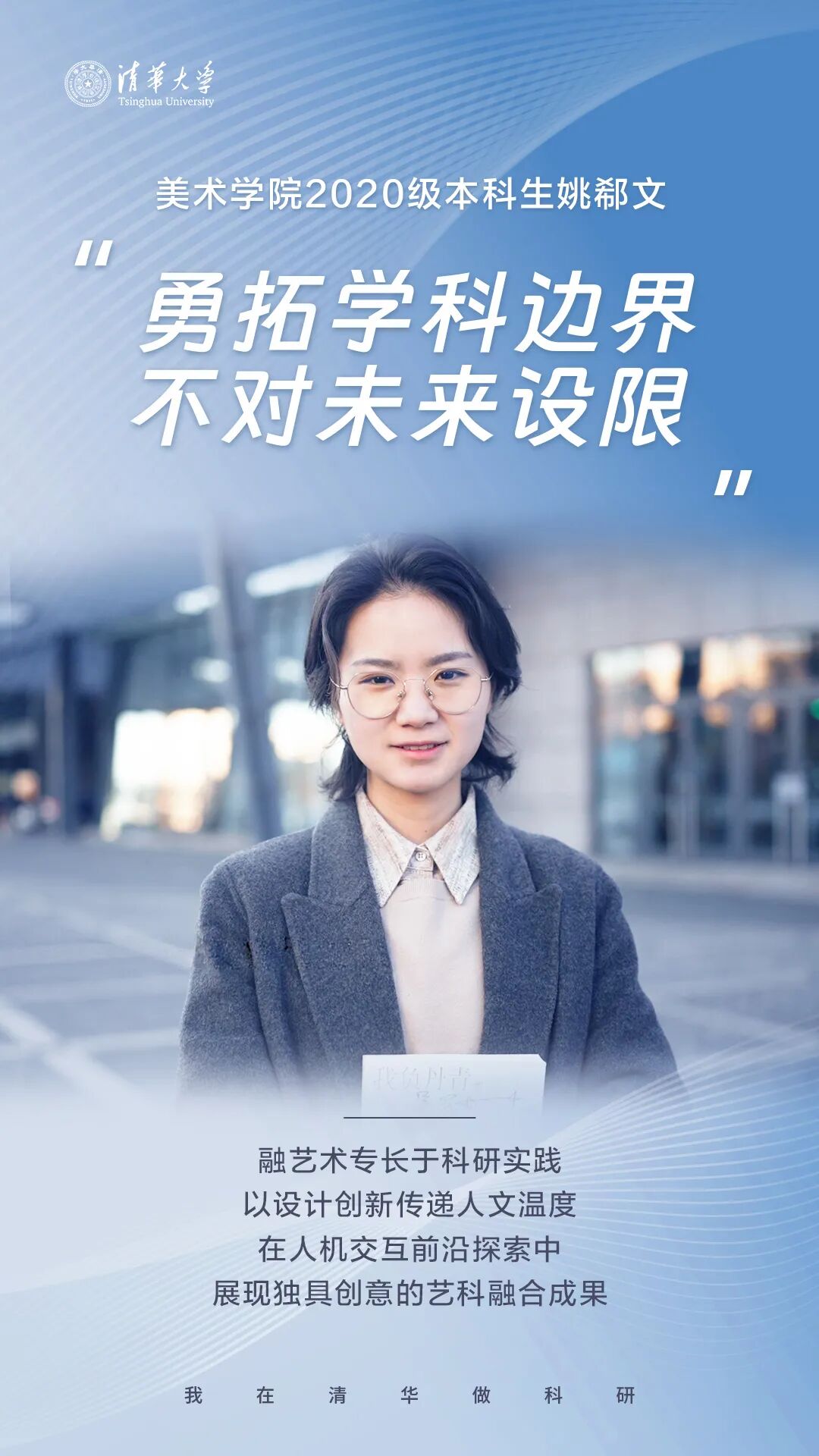 这句轻柔却笃定的自我评价,来自2025年清华大学本科生特等奖学金得主姚郗文。艺术专业的底蕴、大学生士兵的履历,再加上本科阶段深度参与科研项目的实践,共同编织出她独特的成长轨迹,也让她在不断探索中拓展着自己的边界。