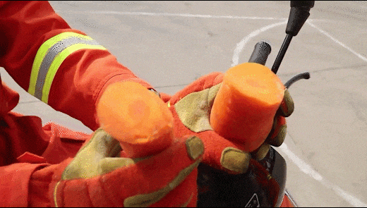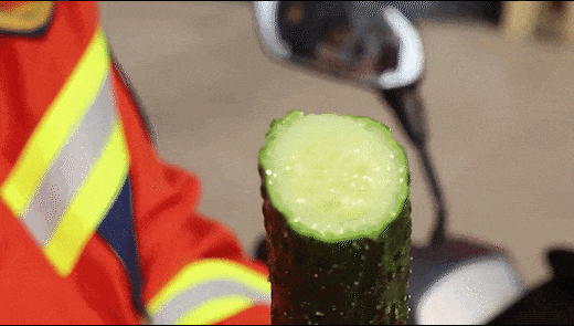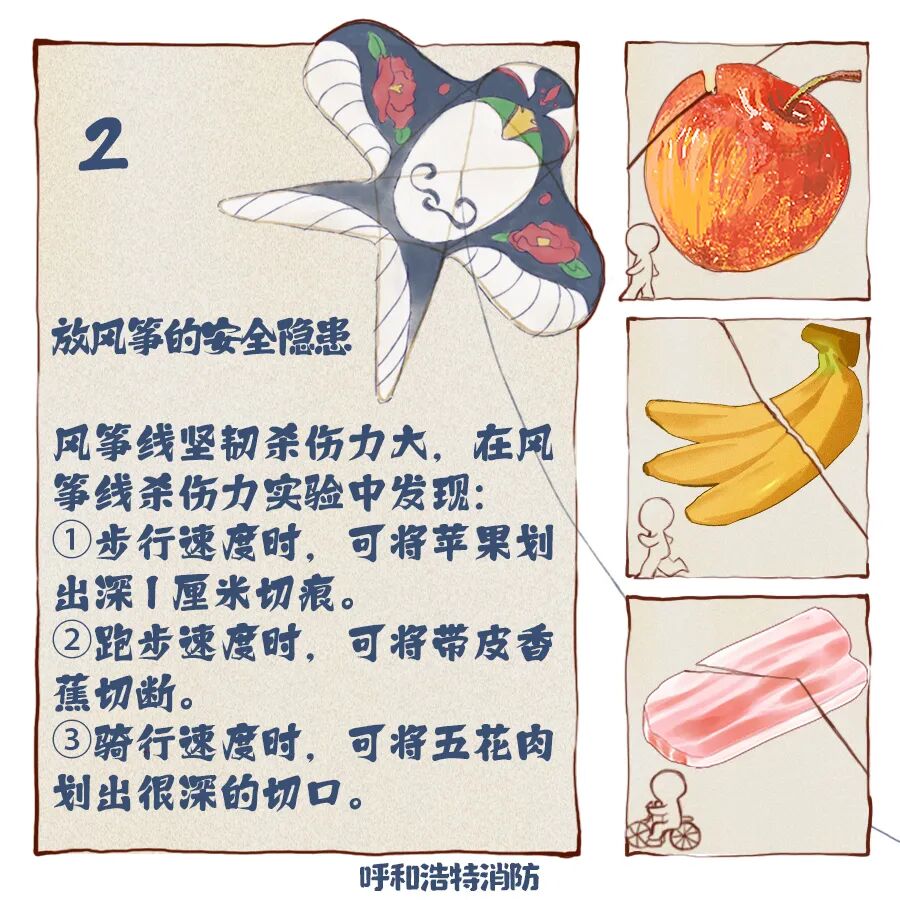 试验过程:试验人员穿戴防护手套,一名消防员绷紧约2米长的风筝线,另一名消防员手持黄瓜骑车经过,模拟人骑车遇风筝线的场景。黄瓜撞上风筝线瞬间被一分为二,切口平整如刀割;随后测试的胡萝卜、苹果也被轻松割开;用猪肉和鸡肉模拟人体皮肤时,风筝线划过留下几厘米深的切口。