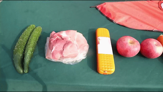 试验准备:消防员准备了黄瓜、胡萝卜、苹果、猪肉、鸡胸肉等道具,选用市场常见的直径约1毫米的尼龙风筝线。
