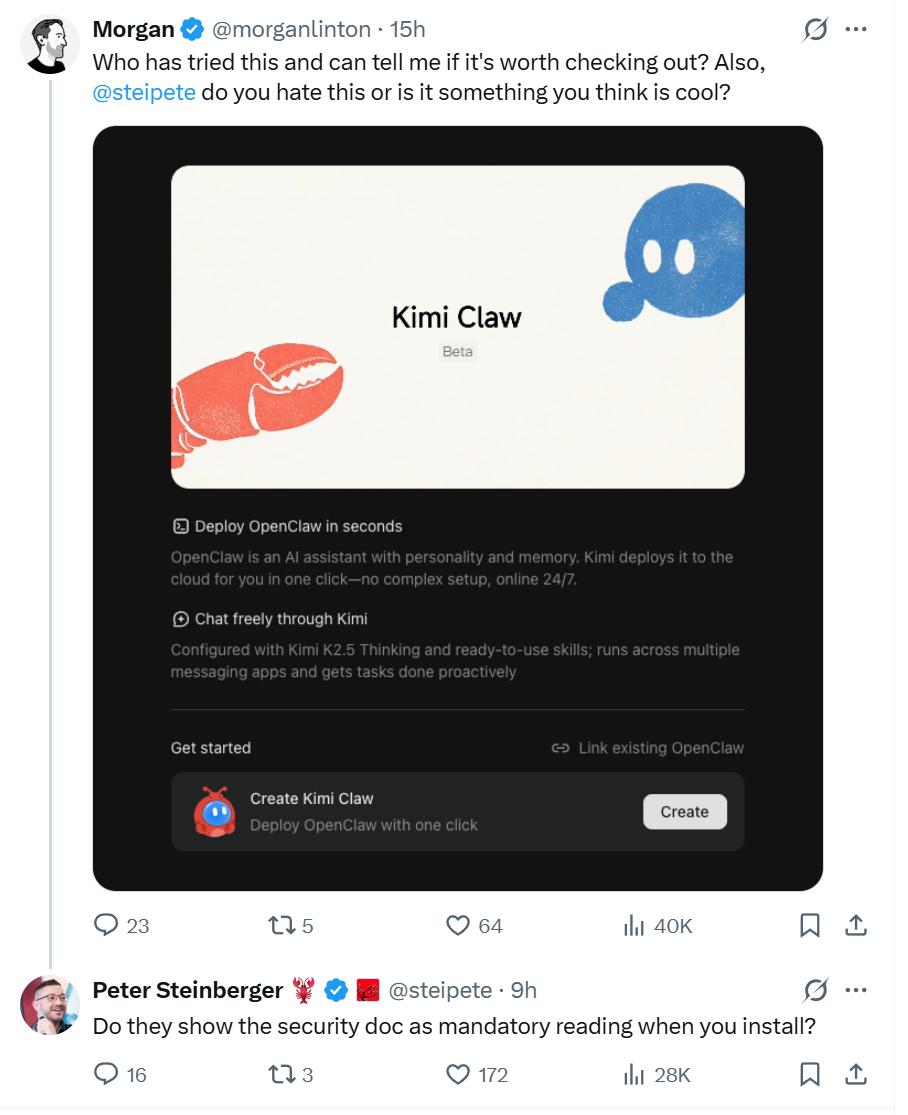 近日,OpenClaw创始人彼得·斯坦伯格公开质疑月之暗面的Kimi Claw产品。起因是月之暗面推出的Kimi Claw云端一键部署服务,与OpenClaw“本地优先”的设计理念相悖——OpenClaw强调agent运行于用户设备,数据不经过第三方;而Kimi Claw将数据迁移至月之暗面服务器,安全与隐私风险等级截然不同。