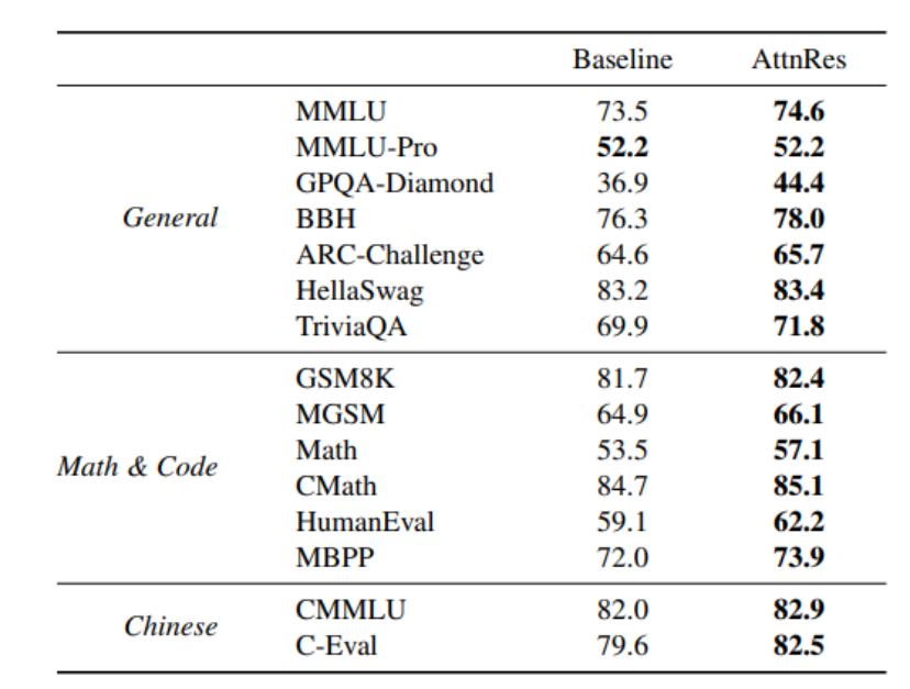 实验验证显示:scaling law实验表明,注意力机制在所有计算预算下均优于基线,效果相当于用1.25倍计算量训练的基线模型;在480亿参数模型的实战测试中(超万亿词预训练),块注意力残差版本在科学问答、数学推理、代码生成等主流任务中全面超越原版。