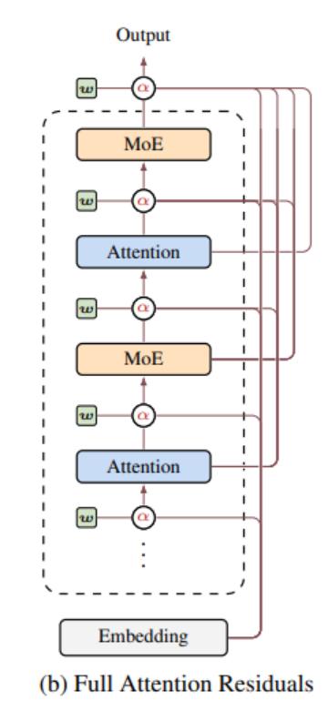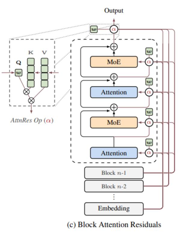 将所有层划分为若干块,块内仍用传统残差连接求和,块间则通过注意力机制选择性聚合。需存储的不再是每层输出,而是每个块的汇总表示,内存占用从O(Ld)降至O(Nd)(N通常为8左右)。