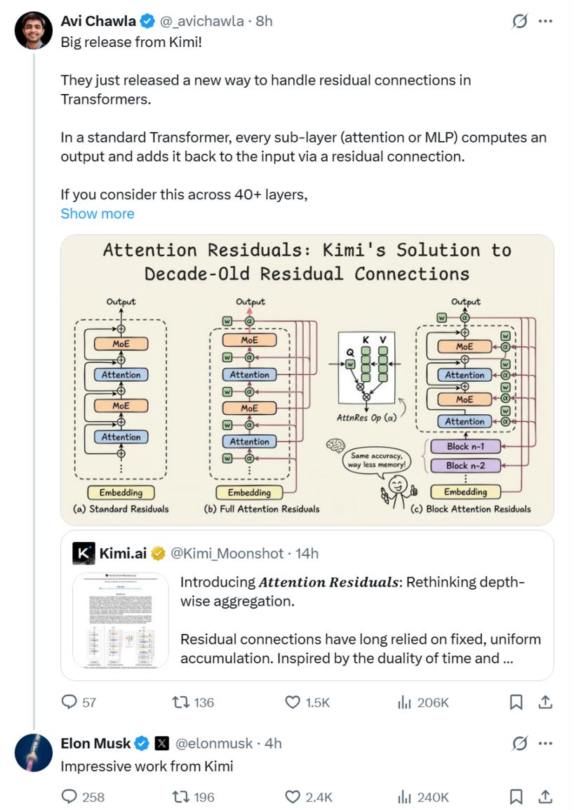 科技博主Avi Chawla在X平台发布长文,深度解析月之暗面Kimi团队最新技术报告。不久后,马斯克在评论区留言:“月之暗面做出了令人印象深刻的成果”(Impressive work from Kimi.)