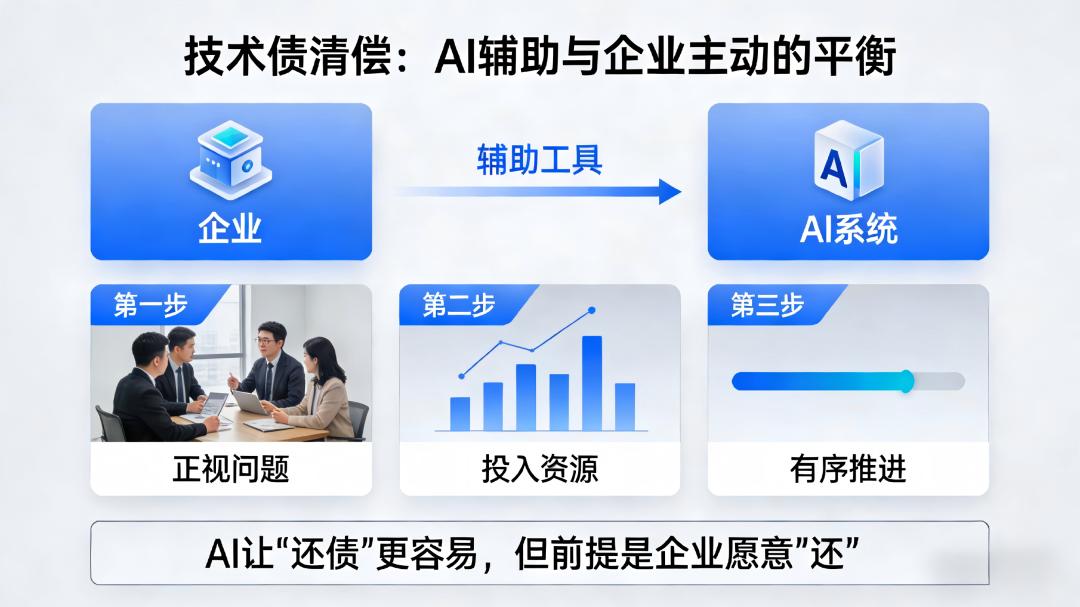 更关键的是,AI无法替企业做出“还债”的决定。那些期望“上线一套AI系统就能自动清债”的企业,很可能会失望。技术债的清偿,依旧需要企业正视问题、投入资源、有序推进。