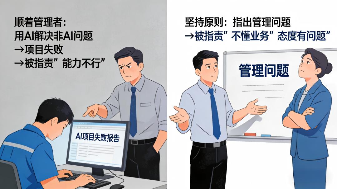 这是一种双重困境:如果技术人员顺着管理者的意思,用AI去解决一个本不该由AI解决的问题,项目大概率会失败,然后被指责“能力不行”;如果技术人员坚持原则,指出管理问题才是根本,又可能被指责“不懂业务”“态度有问题”。