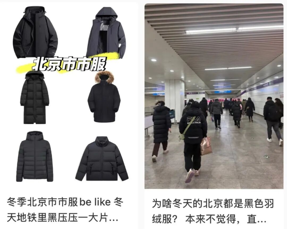 更早的第一届北京黑羽绒服选美大赛,三百多位市民身着被戏称为“北京市服”的黑羽绒服走红毯,不比价格与时尚,只拼实用性和背后的故事。