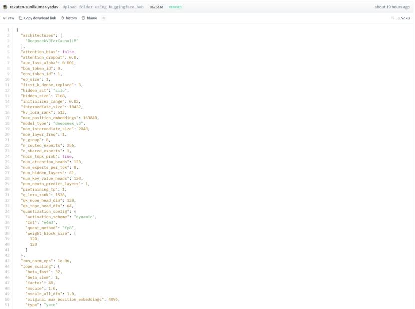 这一发现毫无技术门槛。Rakuten AI 3.0发布后,模型权重按惯例上传至Hugging Face的乐天官方仓库,任何人只需进入“Files and versions”标签页,打开config.json就能看到关键信息。