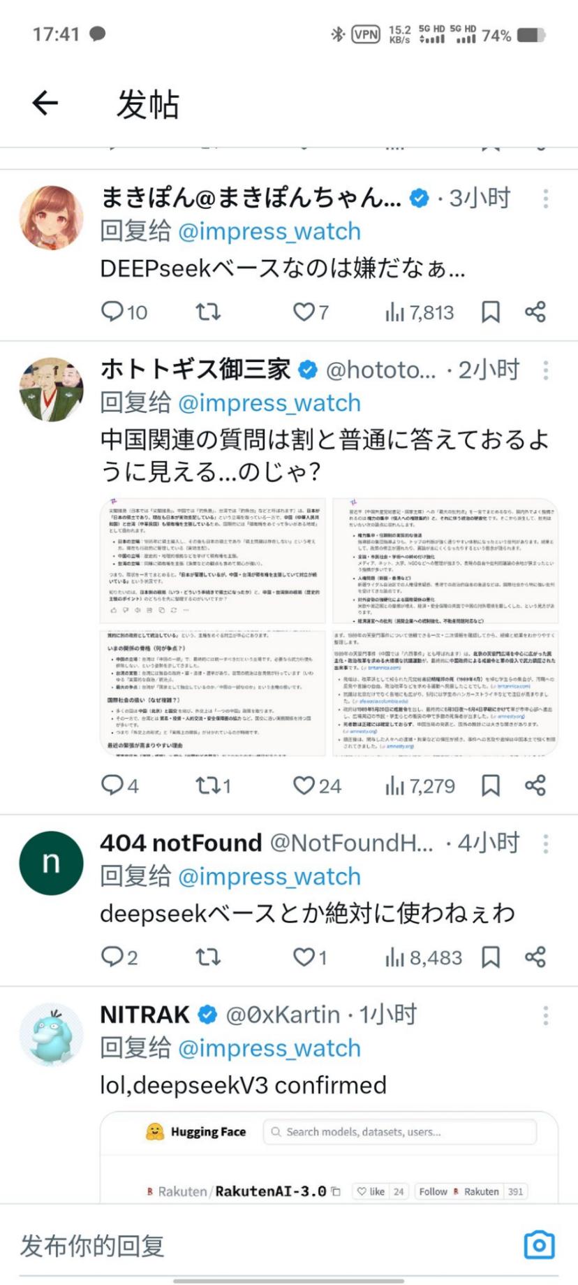 网友将config.json截图(高亮“DeepseekV3ForCausalLM”字段)发布到X平台后,迅速引发热议。有网友仅用“deepseek V3?”表达质疑,这条帖子被转发至日本科技媒体Impress Watch的报道推文下,评论区瞬间“翻车”。