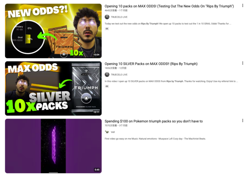 从网上拆卡视频可见,Rips by Triumph能开出经PSA(卡牌认证机构)评级的卡牌,但暂不清楚评级卡是平台直接从二级市场收购,还是购包拆卡后送去评级。