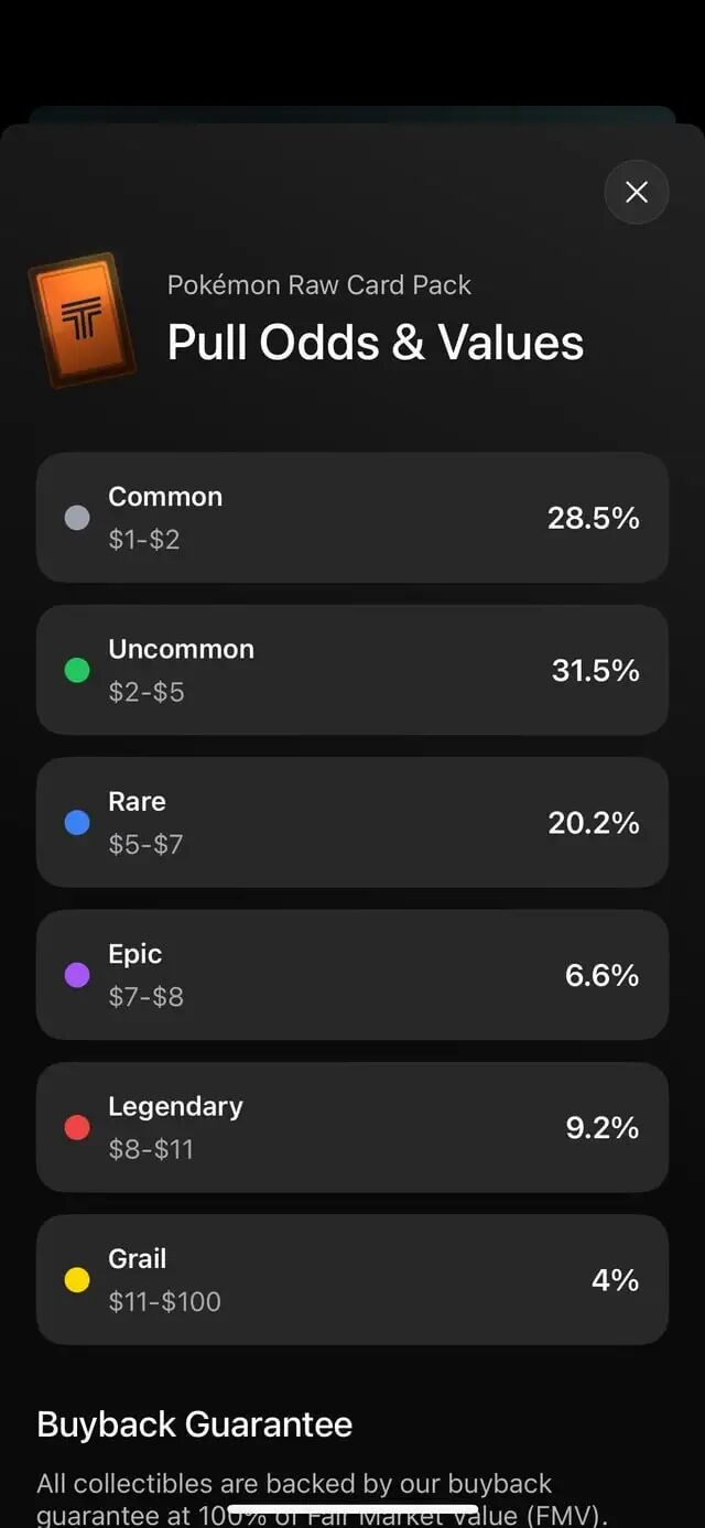 卡包分Normal、High、MAX ODDS三档,单价越高,开出高价稀有卡“Grail”的概率越大。据Reddit用户截图,App购包时会提示开卡几率。