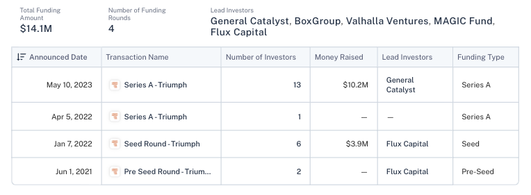 Triumph核心定位是“支撑真金锦标赛的法律、技术和金融基础设施”。截至2023年,完成1410万美元融资,后续多次增资,投资方包括General Catalyst、Drive by DraftKings(美国最大合规体育博弈平台)。