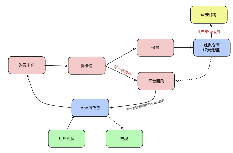 结合上图可知,产品核心循环并非单纯拆卡、购卡,而是通过概率游戏吸引用户拆卡,再以7天内处理保留卡、单卡付运费等流程设计,引导用户走向回购而非收藏。