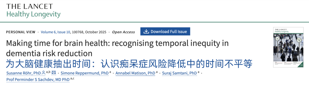①Making time for brain health: recognising temporal inequity in dementia risk reduction. Lancet Healthy Longev. 2025 Oct 13:100768. doi: 10.1016/j.lanhl.2025.100768. Epub ahead of print. PMID: 41101324.