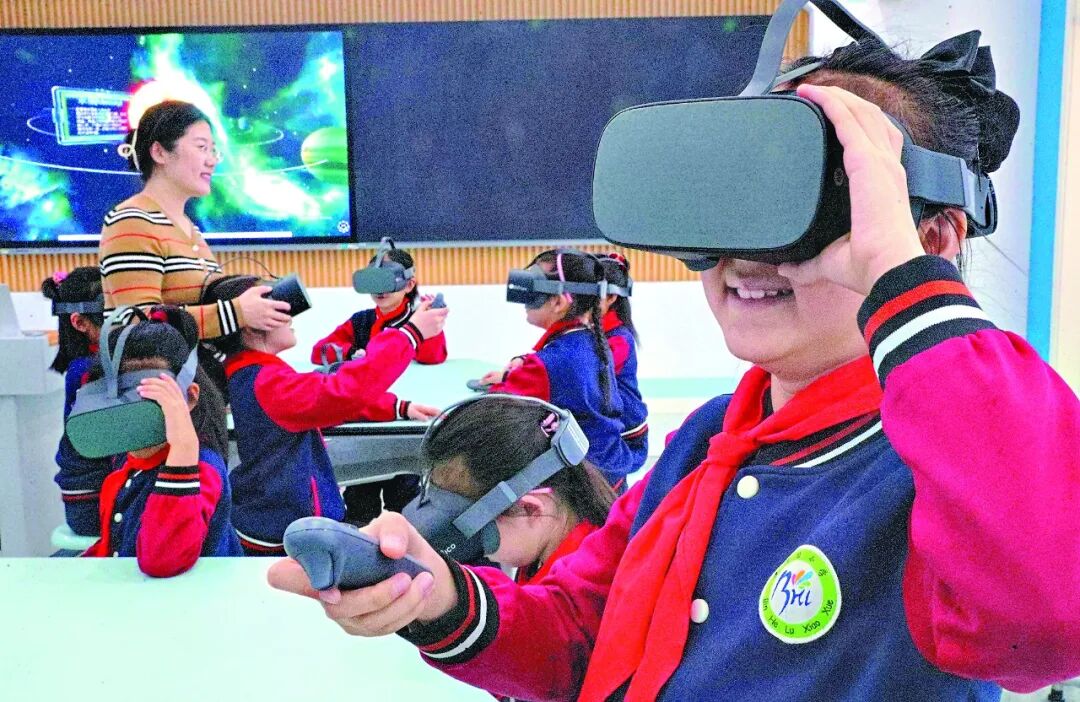 海港区在水一方小学学生使用VR教学设施观看自然科学课件(资料图片)。记者李铎 通讯员曹建雄摄