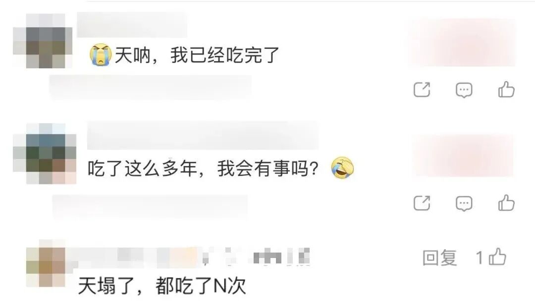 社交平台上,网友们纷纷表达担忧:“吃了这么多年,我会有事吗?”“天塌了,都吃了N次了”。