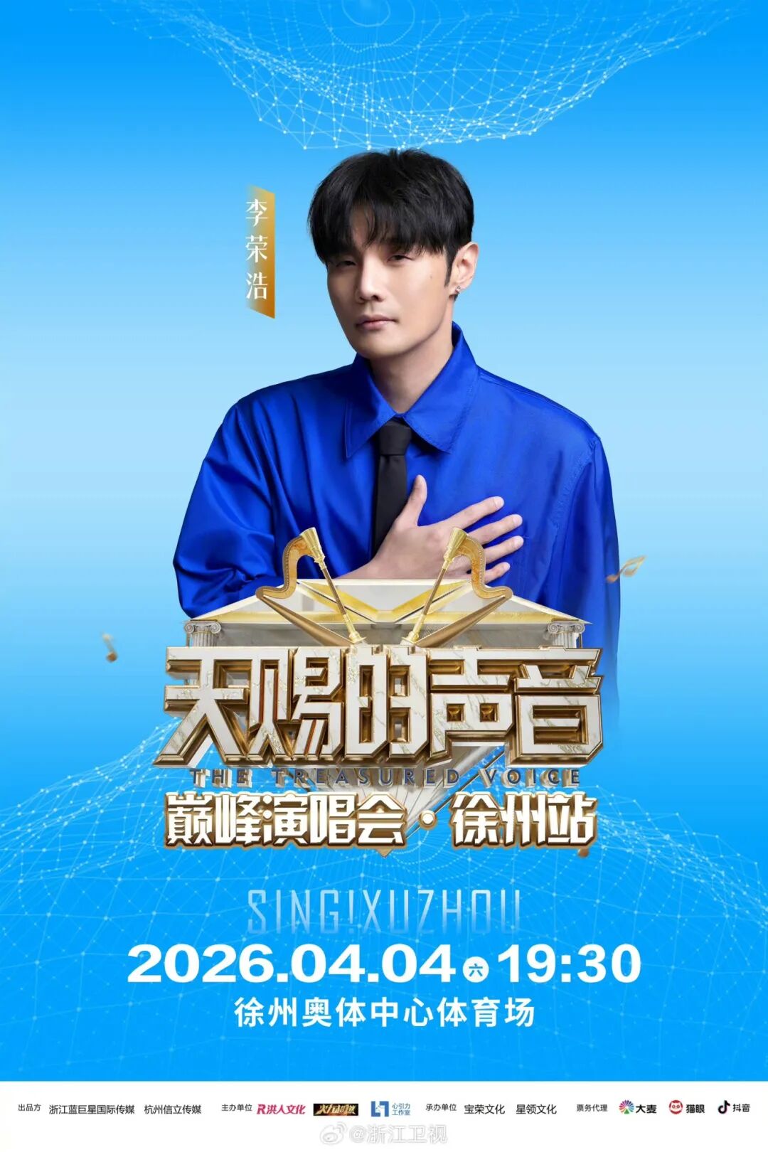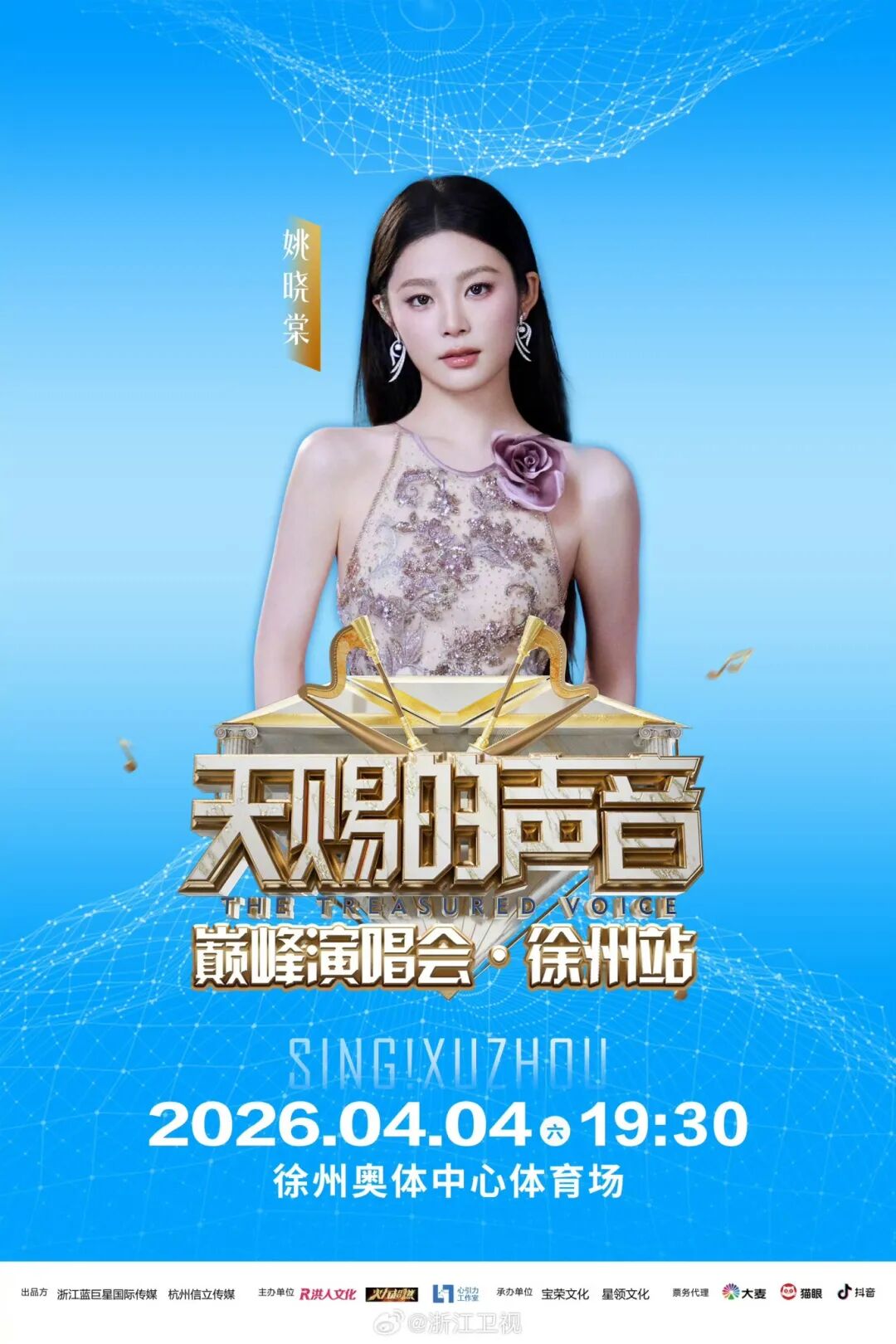 天赐的声音巅峰演唱会徐州站定于2026年4月4日(周六)19:30,在徐州奥体中心体育场举办,黄霄雲、李荣浩、苏有朋、姚晓棠将齐聚云龙献唱。