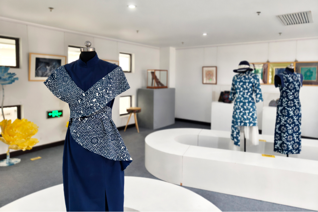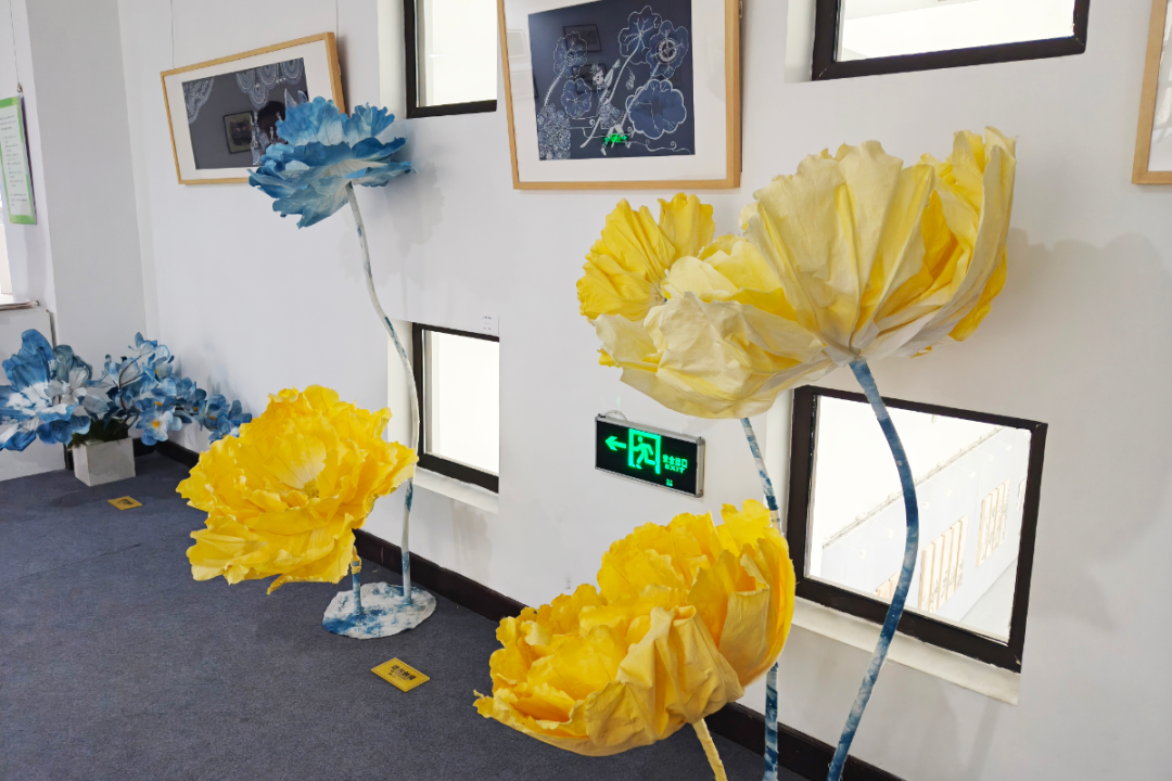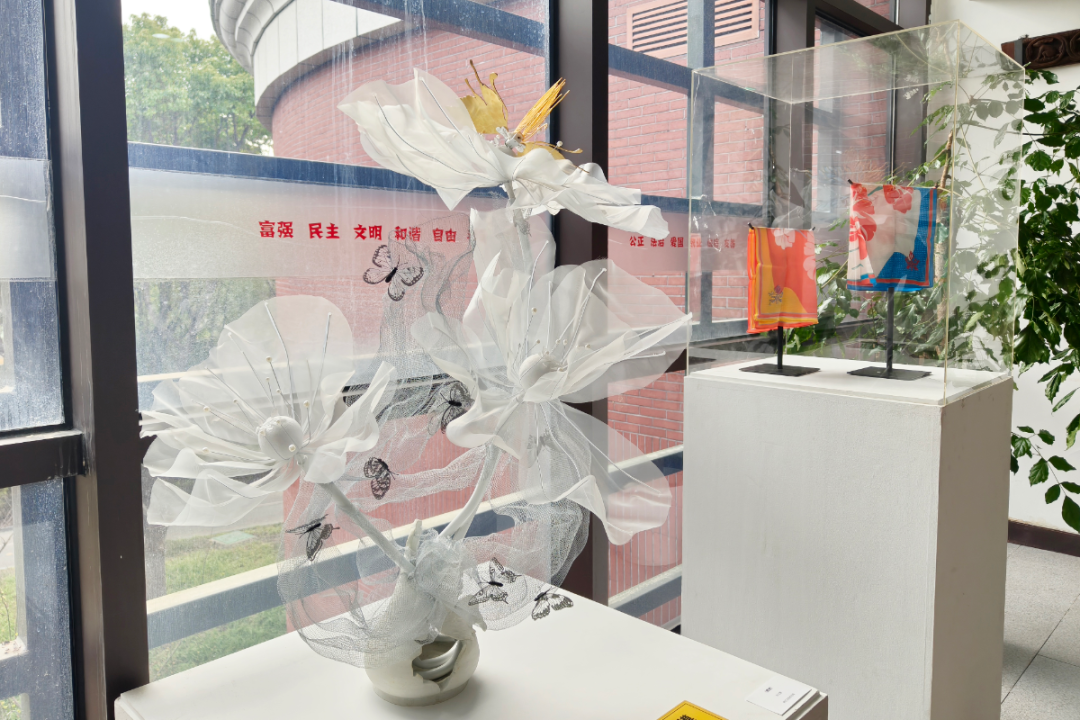 第一板块“花开有时”聚焦馆藏珍品,形态各异的花卉或在画作中绽放,或在精致的漆盒与陶瓷器物上闪耀,传递出跨越时空的静谧之美。第二板块“指尖花影”则展示了非遗技艺赋予花卉的别样生命:蜡染的冰裂纹路、扎染的晕染效果、挑花的细腻纹理,每一件作品都讲述着花卉在织物上“绽放”的故事,质朴中蕴含着动人的力量。第三板块“花衍新生”呈现了花卉的当代演绎,是展览中最具活力的部分。在这里,花卉形象突破传统框架:色彩绚丽的插画作品展现自然的瑰丽与奇思妙想;花与蝴蝶造型的陶艺、掐丝珐琅作品在传统工艺中融入现代灵动;纸、线、布、瓷等材料重组的艺术品,以独特的材质语言赋予花卉全新表达。