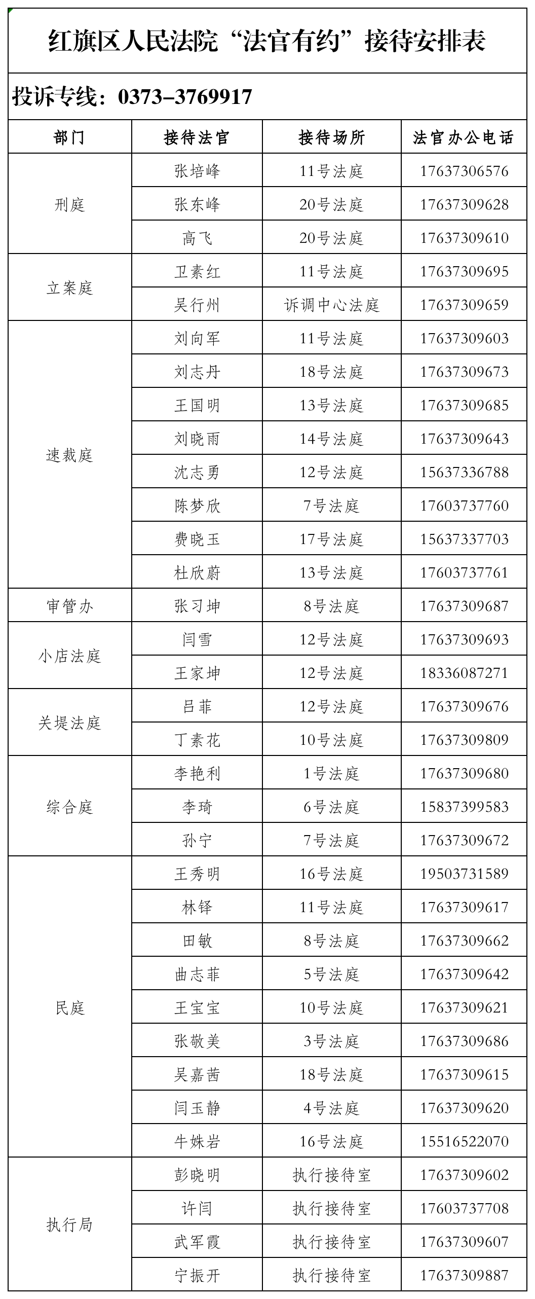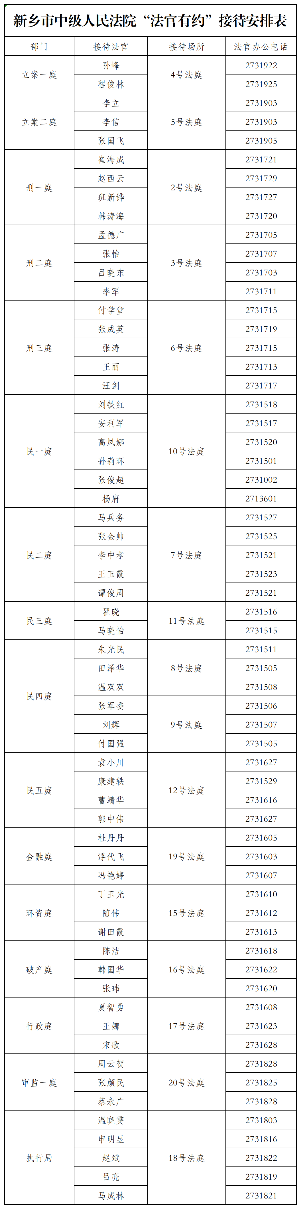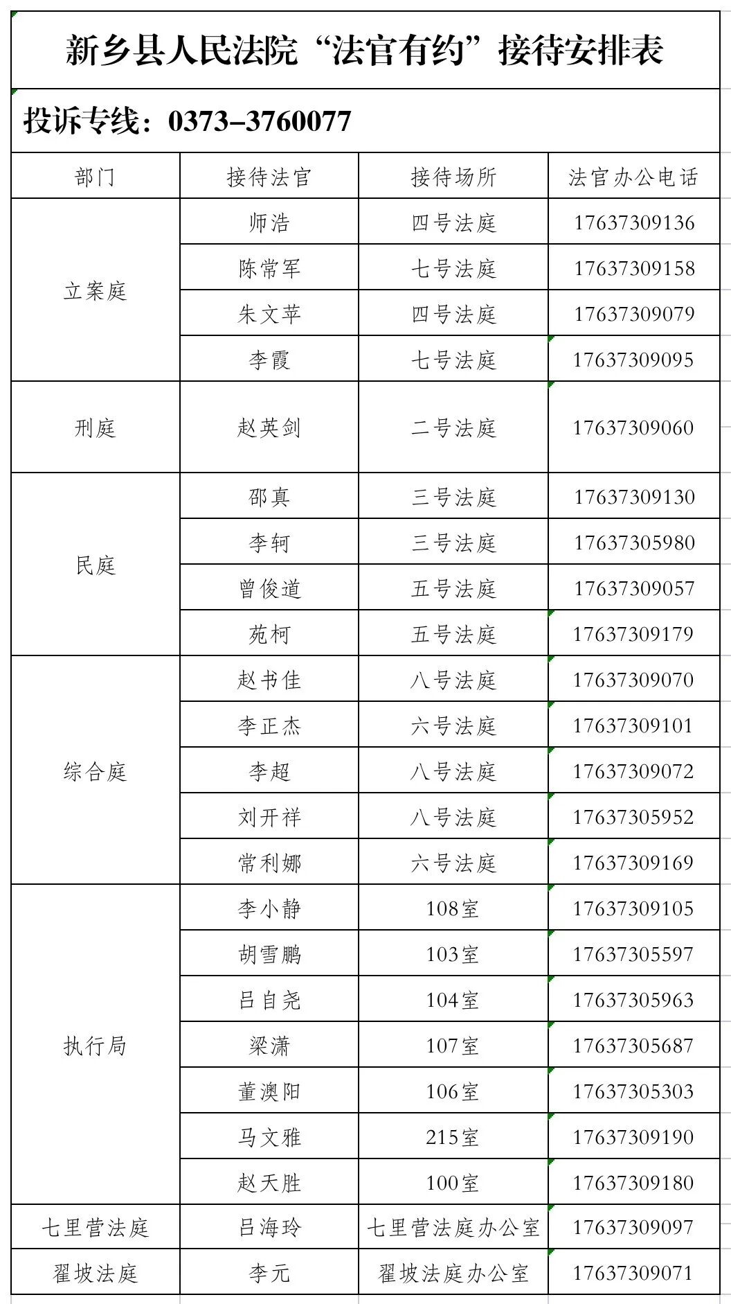 为及时回应群众司法需求,进一步畅通当事人与法官的沟通渠道,新乡两级法院建立了“法官有约”固定接待日制度。每周五下午15:00-17:30,法官将与案件当事人面对面释法答疑。为方便当事人联系约见,现将全市两级法院3月20日“法官有约”接待安排公示如下: