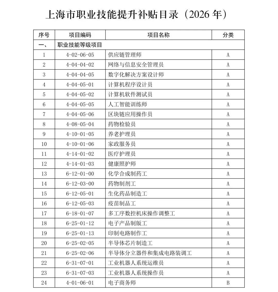 【提醒】2026版上海职业技能提升补贴目录已实施,这些工种能领补贴!