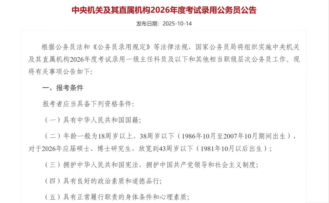 2025年10月,公务员招录年龄首次放宽。(图/国家公务员局官网截图)