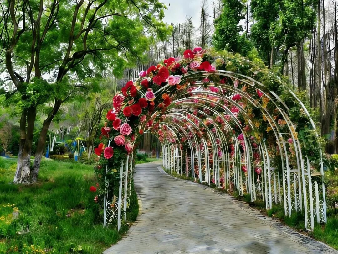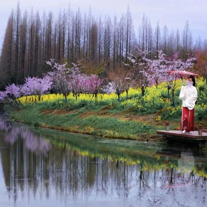 古老树木静默矗立似诗意画卷,缤纷花海翻涌起伏成浪漫波浪。