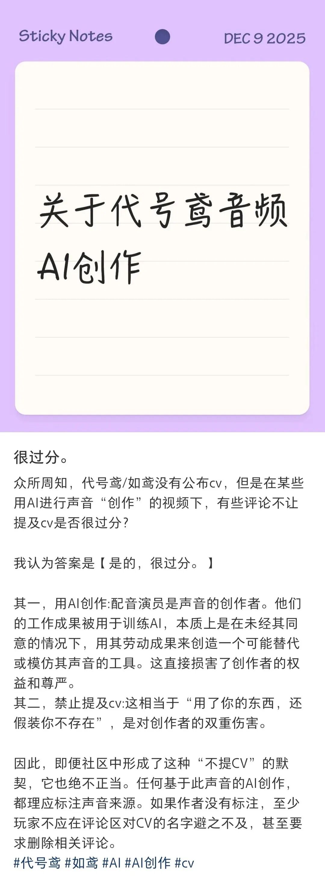 以《代号鸢》和《如鸢》这类游戏为例,制作方未公开配音演员姓名。按理说,同人二创尚在可接受范围,但在信息不透明的情况下,AI配音二创演变成更过分的侵权行为——创作者不仅利用AI模仿未公开的声线,甚至在相关作品评论区严禁提及配音演员本名,仿佛要彻底切断声音与真人的归属关系。