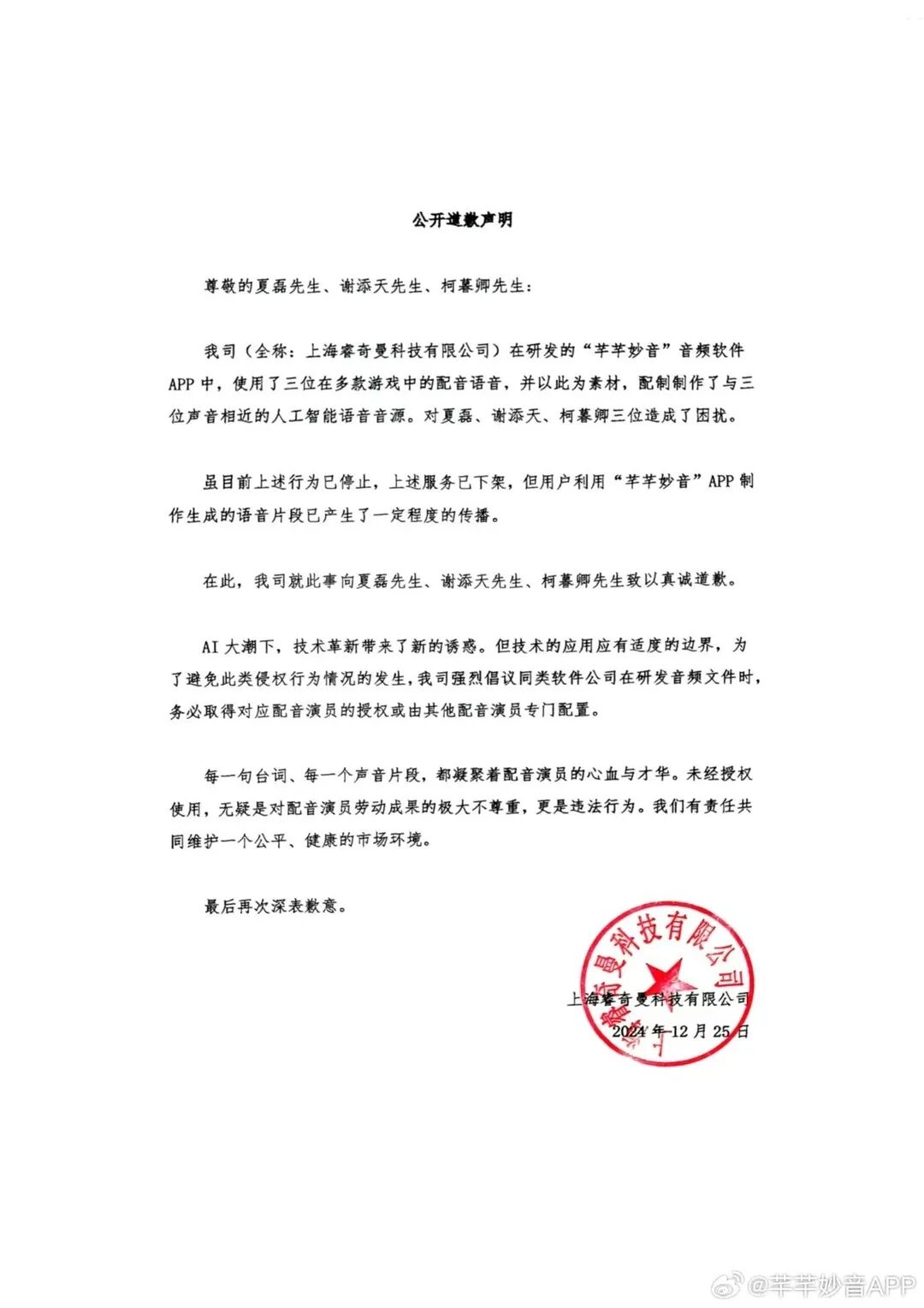 2024年,AI配音软件“芊芊妙音”APP未经授权,擅自使用音熊联萌旗下夏磊、谢添天、柯暮卿三位知名配音演员的语音素材训练人工智能音源。事件曝光后,张杰、夏磊等人曾公开反对,但最终侵权方仅受到较轻处罚,未能有效遏制行业乱象。