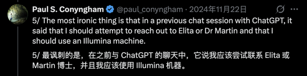 巧合的是,ChatGPT之前就建议过他联系Elita或Martin Smith,并推荐使用Illumina。
