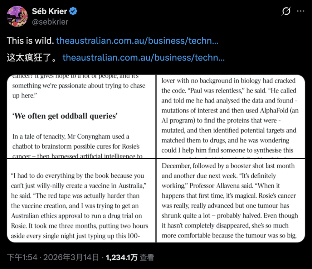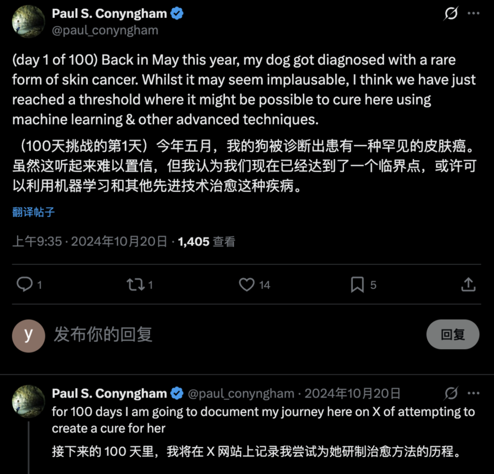 他在X上把这定义为一个近乎不可能的目标:用机器学习和先进方法挽救Rosie的生命。