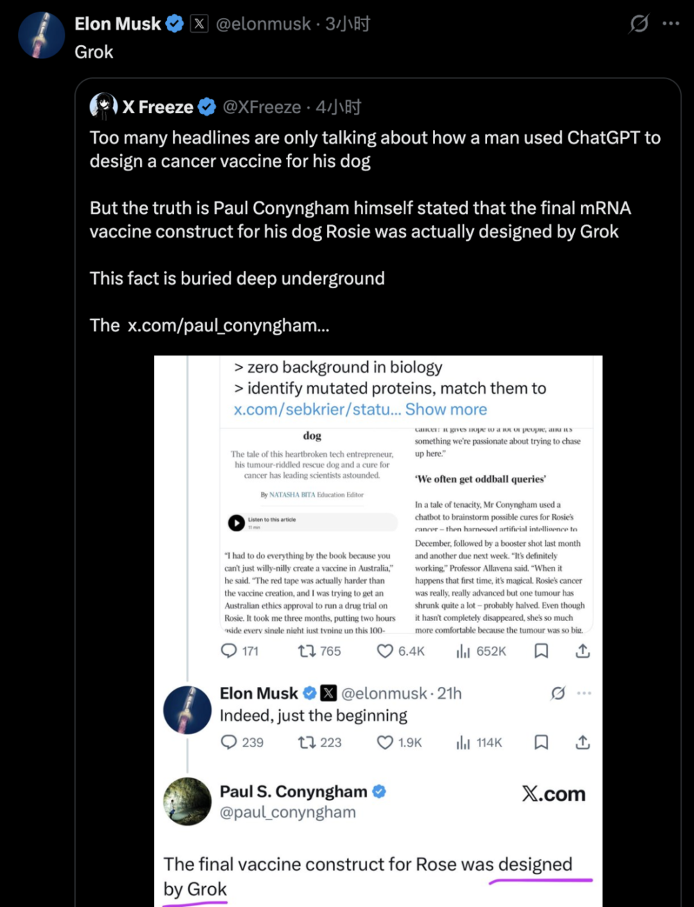 马斯克也转发了相关内容,并强调Grok是主要功臣。