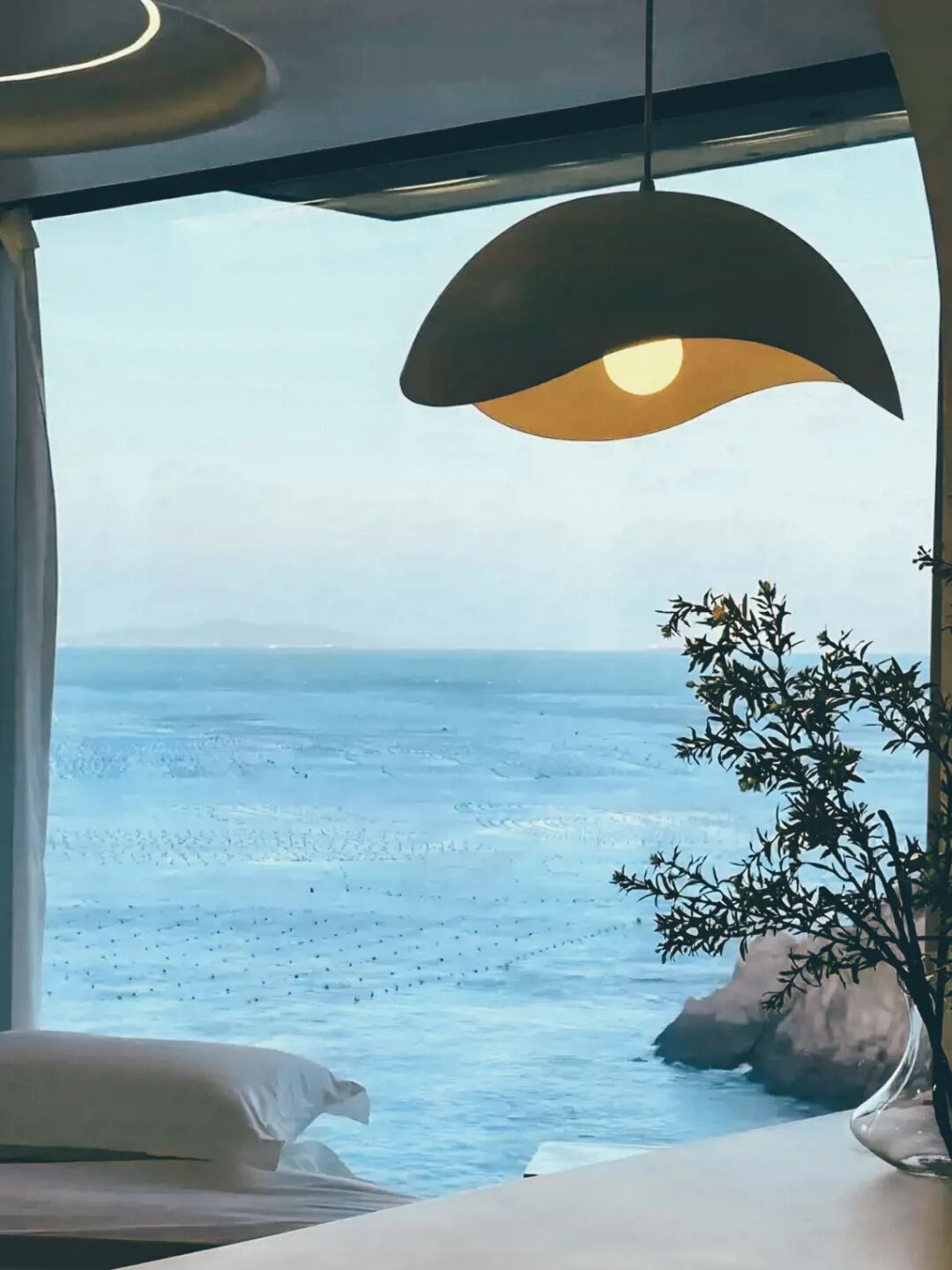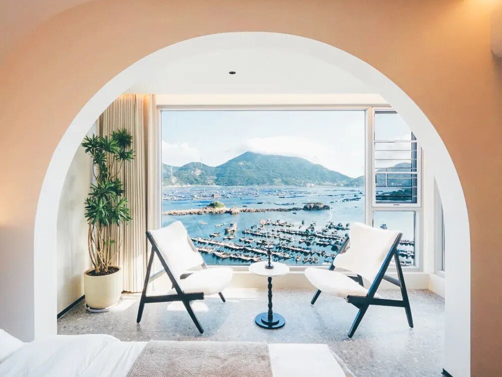 民宿建在黄岐半岛一处靠海的坡地上,建筑以白色和原木为主色调,整体风格简洁明亮。房间空间通透,大面积窗户让海景自然融入室内,被框住的海景像一幅每天都会变化的画。天气好时,还能看到远处的海岛和海面上的渔排。民宿规模不大,因此整体氛围比较安静,适合作为探索黄岐半岛海岸线的落脚点。