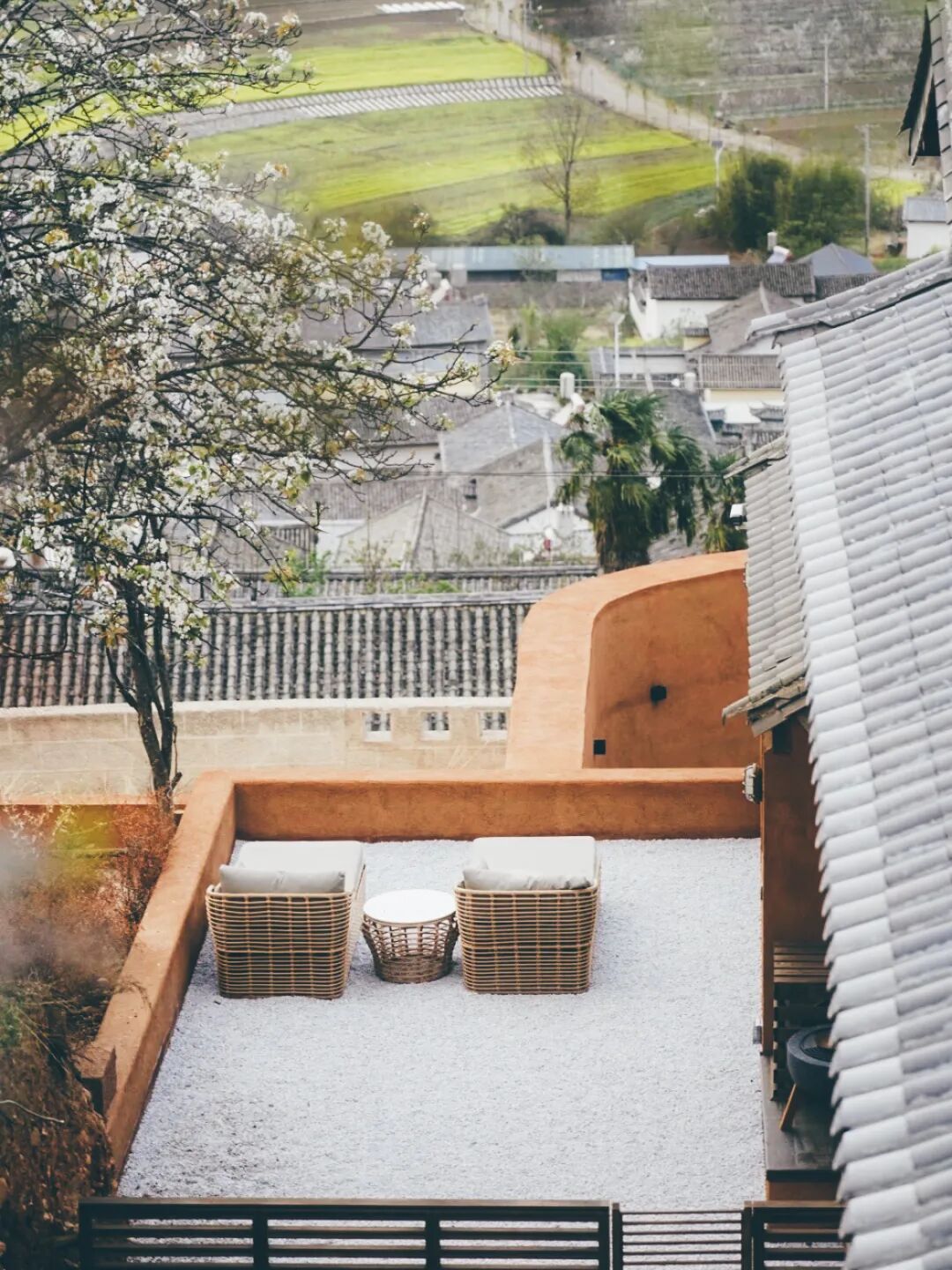 坐落在沙溪古镇外围的一处山坡上,因地势高,视野特别好,能俯瞰整个沙溪坝子和远处的村庄。建筑大量使用木材和石材,与周围的山地融为一体。公共露台是民宿最受欢迎的区域,傍晚时分,住客可以在露台喝咖啡或看夕阳落山,相比古镇内的住宿,这里更安静,也更接近沙溪乡村的生活氛围。